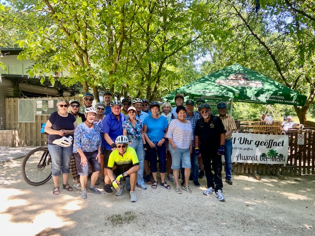 ERZHAUSEN (ar) 19 Radlerinnen und Radler folgten der Einladung der SPD AG 60 plus zu einer Radtour nach Münster zur Auszeit bei Maki, einem hübschen Freizeitgelände mit Biergarten. Hautnah erlebten die Teilnehmer die brutale Trockenheit im Messeler Forst, die man spürt auch wenn alles grün ist. Man fühlt sogar die Waldbrandgefahr. Insbesondere der Anblick der Baumstümpfe entlang des ehemaligen Muna Gebietes, das ja schon in den vergangenen Jahren von Sturm und Feuer heimgesucht wurde, bereitet große Besorgnis. Bei Matti in der Auszeit legten wir eine Rast ein bei leckerem Essen, Kaffee und Kuchen und anderen Getränken, die man hier im Schatten herrlich genießen kann.