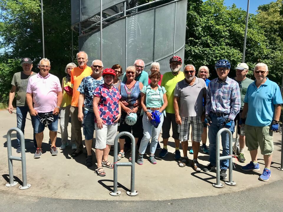 Erzhausen (hm) Dieses mal führte uns die Radtour in den Landkreis Offenbach. Die Strecke ging Richtung Nordost auf überwiegend kühlende Waldwege oder auch auf sonnenüberflutete Wiesen- und Feldwege. Gestartet wurde letzte Woche Dienstag um 11 Uhr am Hessenplatz. Der erste Abschnitt ging durch die Koberstadt zur Keltenprozession auf der Bulau. Auf dem Höhenzug hatte man eine wunderbare Aussicht bis zum Spessart und Odenwald. Nach kurzem Aufenthalt ging es dann weiter zum Wingertsturm nach Dietzenbach. Der Turm wurde vom Architekten Wolfgang Rang entworfen und 2001 errichtet, es ist eine 33 Meter hohe Stahlkonstruktion mit einer Aussichtsplattform. Einige Radler haben es sich nicht nehmen lassen den Turm mit 119 Stufen zu erklimmen. Zur Löschung des Durstes und zur Stärkung erfolgte im Anschluss die Einkehr in die Gaststätte des HSV-Götzenhain, da wurden wir gut und reichlich bewirtet. Der Rest der Strecke führte über Langen und Egelsbach gegen 16 Uhr zurück in die Heimat. Es war wieder mal eine gelungene Tour die über knapp 40 Kilometer führte und dabei 18 Radler*innen teilgenommen haben. Ganz besonders freut es das SPD-Orgateam das auch immer mehr Frauen an unseren Fahrradausflügen teilnehmen.