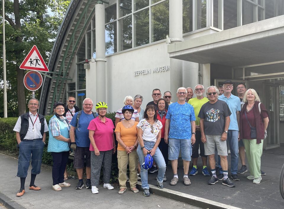 Unser heutiges Ziel war für 20 Teilnehmer das Zeppelinmuseum in Zeppelinheim, das ein Stadtteil von Neu-Isenburg ist. Nach einer zügigen Radtour erreichten wir nach 1 Stunde unser Ziel. Hier erwartete uns eine Führung im 1988 neu erbauten Zeppelinmuseum mit Frau Lindemann von der Stadt Neu-Isenburg. Mit der Eröffnung des Flug- und Luftschiffhafens Rhein-Main startete auch der Transatlantikverkehr von hier aus. Daher wurde die ehemalige Luftschiffersiedlung Zeppelinheim in unmittelbarer Nähe des neuen Arbeitsplatzes errichtet. Die 1909 erbaute Siedlung hieß übrigens damals das "rote" Dorf, weil die Arbeiter meist aus dem SPD Milieu stammten.