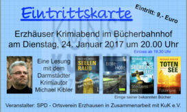 Am Dienstag, 24. Januar um 20.00 Uhr wird der SPD-Ortsverein in Zusammenarbeit mit KuK e.V. einen Krimiabend im Bücherbahnhof veranstalten. Der bekannte Darmstädter Krimiautor Michael Kilber liest aus seinem neuen Kriminalroman “Seelen Raub“ vor. Karten hierfür sind erhältlich im Reisebüro Thomaschautski, Bücherbahnhof und bei Sabine Leiser.