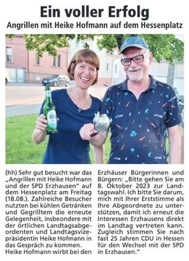 ERZHAUSEN (hm) Kurz vor der Landtagswahl, die am Sonntag, 8. Oktober stattfindet, wird die Landtagsabgeordnete und Landtagsvizepräsidentin Heike Hofmann gemeinsam mit dem SPD-Ortsverein Erzhausen am Mittwoch, 4. Oktober von 10 - 12 Uhr an der Heegbach-Apotheke mit einem Infostand präsent sein. Hier wird insbesondere Heike Hofmann für Gespräche und Fragen zur hessischen Landespolitik zur Verfügung stehen.