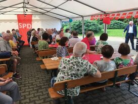 ERZHAUSEN (hm) Auch für dieses Jahr hatte sich das AG 60 plus - Team wieder entschlossen ein Sommerfest zu feiern, der Einladung hierzu sind über 75 Besucher*innen gefolgt. Gefeiert wurde am Donnerstag, 17. August an der Erzhäuser Grillhütte und um 15 Uhr sind die ersten Besucher eingetroffen. Nach einer kurzen Begrüßung und Bekanntgabe aktueller Veranstaltungsterminen von Horst Müller wurde das reichhaltige Kaffee- und Kuchenbuffet eröffnet. Im Anschluss daran gab es eine Überraschung. Das Orga-Team hatte einen Zauberer engagiert, der uns dann 45 Minuten lang in die Welt der Zauberkünste verführte. Zum Abschluss wurde der Zauberer mit großem Applaus verabschiedete. Zwischenzeitlich ist der Bundestagsabgeordnete Andreas Larem und die Landtagsabgeordnete und Vizepräsidentin des Hessische Landtags Heike Hofmann eingetroffen. Andreas sprach einige Grußworte und führte viele Einzelgespräche mit den Besuchern. Heike ging in ihrer Rede auf die derzeit politische Lage in Hessen ein. Sie bemängelte hierbei das zur Zeit gerade in den Kitas, bei der Polizei, in der Pflege, in Schulen und im Handwerk Arbeitskräften fehlen und warb dafür sie wieder mit der Erststimme am Sonntag, 8. Oktober 2023 direkt in den nächsten Landtag zu wählen. Auch sie mischte sich dann unters Publikum und suchte das Gespräch. Ab 18 Uhr hatten dann die Küchenchefs Hans und Stefano zum Abendessen aufgerufen. Auch in diesen Jahr hatten sie wieder leckeres für uns zubereitet, als Nachtisch gab es Eis. Danach saß man noch bei einem Bier, Glas Wein oder einem Aperol-Spritz, noch gemütlich zusammen um das Sommerfest langsam ausklingen lassen. Zum Abschluss noch vielen Dank an die vielen Helfer des SPD-Zeltauf- und abbaus, des Kaffeebuffets, der Thekenmannschaft und dem Küchenteam. Ohne sie wäre eine solche Veranstaltung überhaupt nicht durchführbar gewesen. Alle waren sich einig auch im nächsten Jahr mit SPD-AG 60 plus wieder ein Sommerfest zu feiern.
