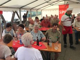ERZHAUSEN (hm) Am Freitag, 19. August war es wieder so weit. Das alljährliche Sommerfest des SPD-Ortsvereins AG 60 plus fand an der Erzhäuser Grillhütte mit über 75 Gästen statt. Hierfür wurde bereits am Vorabend das große SPD-Festzelt mit Küchenerweiterung aufgestellt. Eröffnet wurde die Veranstaltung um 15:30 Uhr mit einer großen Kaffee und Kuchentheke. Gegen 16 Uhr besuchte uns unsere Landtagsabgeordnete und Vizepräsidentin des Hessischen Landtags Heike Hofmann, angereist war sie mit dem Fahrrad aus Gräfenhausen. In ihrer Rede hatte sie aktuelle Themen der Bundes- und Landespolitik angesprochen. Auch der grausamen Krieg in der Ukraine war ein Thema. Um Punkt 17 Uhr kam der Auftritt auf den alle gespannt waren. Dem Orgateam war es gelungen den allseits aus Funk und Fernsehen bekannten Pizzabäcker Ciro zu engagieren. In seinem 45 minütigen Auftritt hat er die Lachmuskeln der Festbesucher in vollen Zügen strapaziert. Zum Abschluss seines Auftritts wurde noch gemeinsam sein Lied „Ciro mach Amore mit mir“ gesungen und dabei geschunkelt. Nun war man gespannt, was die Köche Hans uns Stefano mit ihrer Assistentin Ingrid als Abendessen servieren werden. Zuerst wurde eine leckere Vorspeisepalette angeboten und danach gab es Schnitzel, mit verschiedenen Soßen, Bratkartoffeln und Krautsalat. Auch Rinds- und Bratwürste mit Currysoße waren im Angebot. Als Nachtisch gab es noch ein kleines Eis. Nach vielen interessanten Gesprächen an den Tischen hat dann Horst zum Mikrofon gegriffen und bereits terminierte und geplante Aktivitäten für den Rest des Jahres bekannt gegeben. Näheres hierzu wird zum gegebenen Zeitpunkt im EA und auf unserer Webseite (www.spd-erzhausen.de) veröffentlicht. So gegen 23 Uhr haben dann die letzten Gäste die Veranstaltung verlassen.