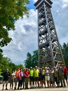 ERZHAUSEN (hm) Am Dienstag letzter Woche wurde wieder eine Radtour durchgeführt, los ging es am Hessenplatz um 10:30 Uhr. Mit 23 Radler*rinnen wurde pünktlich gestartet. Das Ziel war der Goetheturm in Frankfurt-Sachsenhausen. Die Strecke führte auf gut ausgebauten Wegen über Egelsbach, Langen und Dreieich. Am Goetheturm angekommen, haben es sich die Radler*innen nicht nehmen lassen den Turm zu besteigen. Er ist 43,3 Meter hoch und 196 Stufen waren zu überwinden. Bei herrlichem Wetter und guter Fernsicht war die Skyline von Frankfurt, die Europäische Zentralbank, der Taunus, der Odenwald u.s.w. zu bestaunen. Es war eine wunderschönes Panorama! Nach dem beschwerlichen Auf- und Abstieg des Goetheturms hatten alle großen Hunger und Durst, dazu musste allerdings erst nochmals der Drahtesel bestiegen werden. Nach ca. 20 Minuten wurde dann in Neu-Isenburg in einer Kleingartenanlage in Freddy´s Engwaadstubb im Biergarten eingekehrt, hier konnte man sich bei gepflegten Getränken und gutem Essen für die Heimfahrt stärken. Die Rückfahrt führte über Buchschlag nach Langen und dann über den Radschnellweg zurück in die Heimat, wo wir so gegen 17 Uhr angekommen sind.