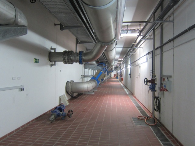 Uns wurde auch die Möglichkeit eröffnet die Technik unter der Erde zu erkunden. In einem langen Gang durchziehen Leitungen und Kabel den Untergrund. In den Rohrkellern erstreckt sich ein kilometerlanges Netz für Kommunikation, Energieversorgung und den Transport von Wasser und Schlamm.